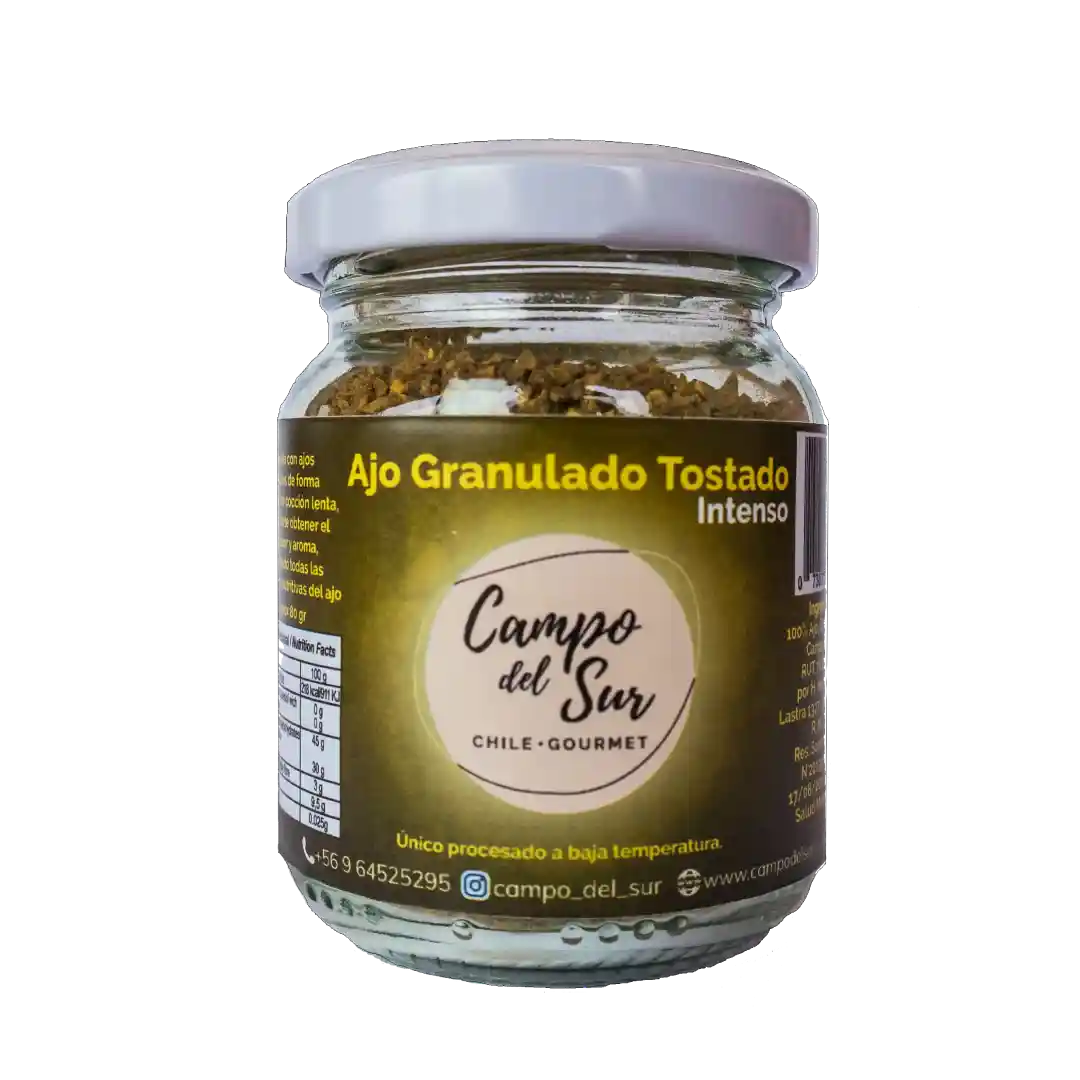 Ajo Tostado Granulado es un producto gourmet elaborado por Campo del Sur, exclusivamente con dos variedades (ajo blanco y rosado) de los mejores ajos chilenos, su proceso es a baja temperatura (menos de 60 grados) y se procesan lentamente para obtener un sabor intenso y con aromas cítricos y a frutos secos tostados.